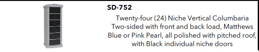 Feature columbaria have any where from 12 niches to 72 niches. Designed to be purchased by a church or cemetery.